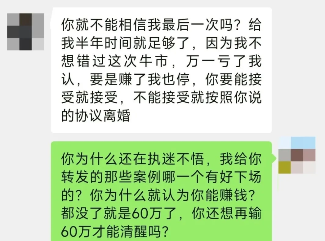 都已经输了这么多钱了,为什么还不知道回头?他拿出最近几天赚钱的账单给我看,每天都能挣一两千,还说股票目前的形式大涨,所有的专家都在说牛市马上到来,我炒股几年就等待这个时候,不坚持下去怎么回本,反正说什么都不愿意卖股票变现。