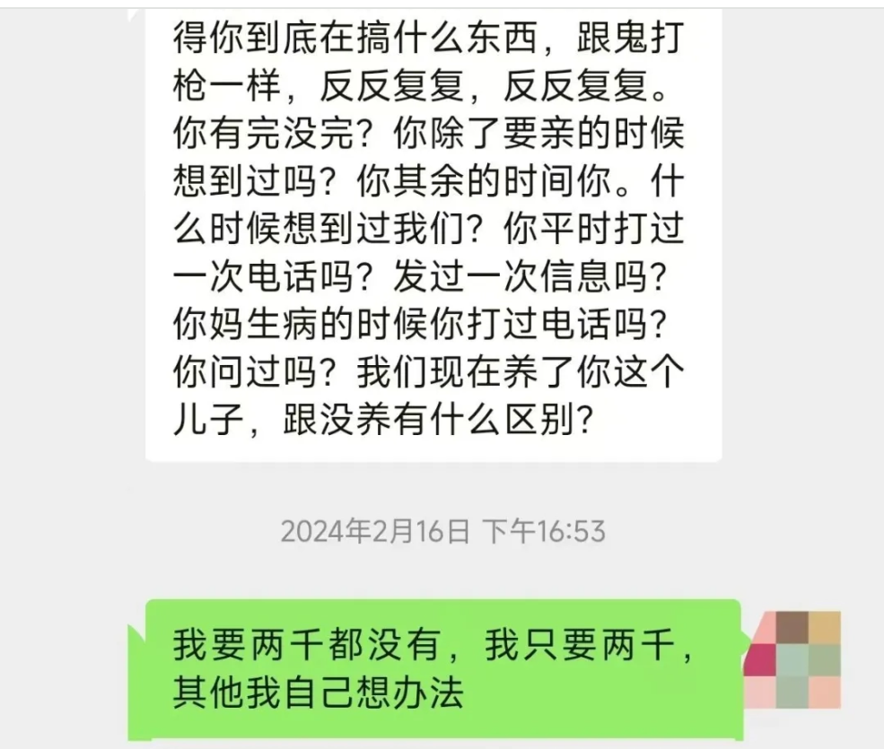 2022年4月,当时网贷上又欠了14万,我在小店把最后800块的花呗刷出来之后就跑路了,因为我知道爸妈肯定不给我还,第一次还就墨迹的不得了,这次估计要杀了我,所以我没打招呼直接跑路。后来他们的电话就不停的打,然后我在微信里跟他们坦白了,之后就把手机关了,到了第二天我已经在异地的一个宾馆里,打开手机一看,爸妈给我发了一百多条信息,其中90多条都是骂我的,然后我就气不过的在微信上骂他们,说这一切都是他们逼的,债务我自己还,大不了我拿命来顶。
